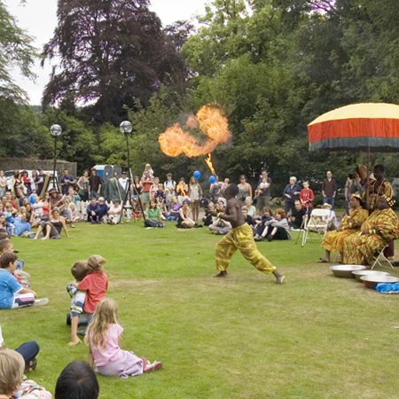 The wife of the African Chief, the African Chief, and his drummers - with Traquair House in the background.